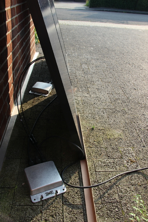 Die Aufstellung erfolgte an einer Hauswand, hinterden Modulen liegt jeweils ein Wechselrichter und die Verbindung zum Netz geht über das SMA Multigate. Eine solche Anlage kann an jedem Balkon Verwendung finden.